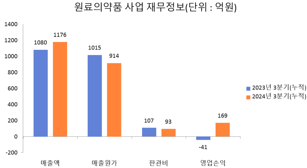 공시 자료에 따르면, 종근당바이오는 지난해 3분기 누계 실적 기준으로 원료의약품 사업에서 영업손실 41억원을 기록했다. 반면, 올해 3분기까지 원료의약품 사업 영업이익은 169억원으로 집계됐다.