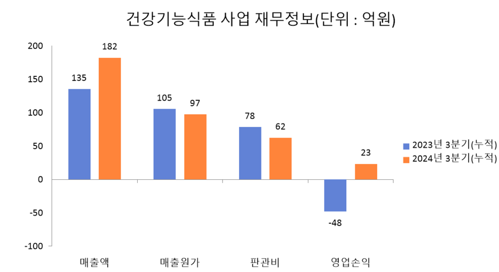 매출액 확대는 영업이익 흑자 전환을 뒷받침했다. 올해 3분기까지 건기식 매출액은 182억원으로 전년 동기 대비 34.7%(46억원) 늘었다. 3분기에 건기식 매출액이 500만원 줄었으나, 1·2분기 매출액 증가분(47억원)이 감소분을 상쇄했다.