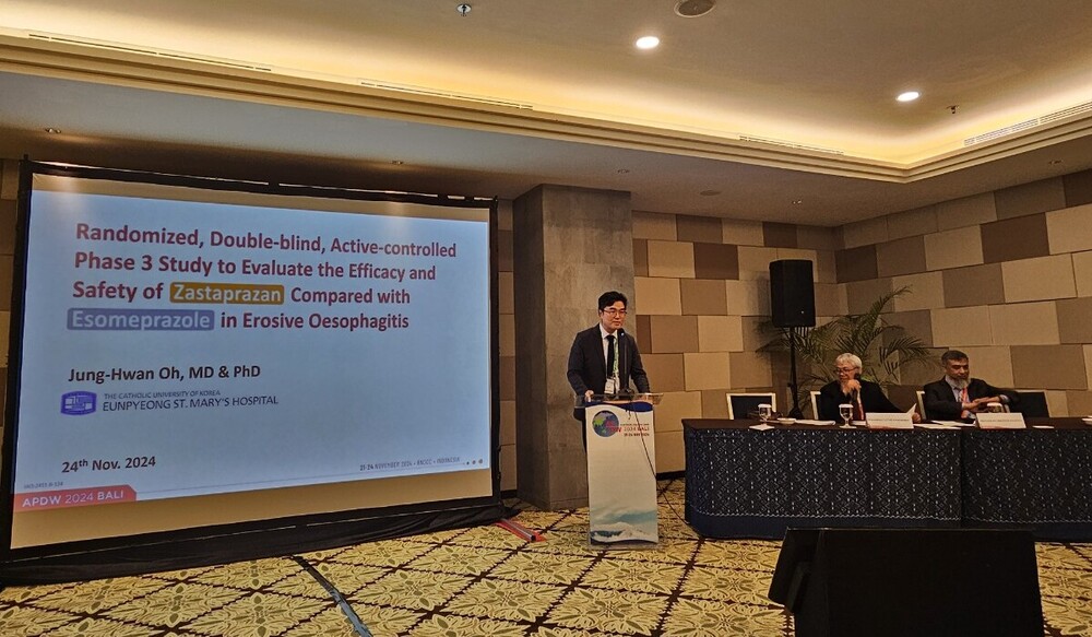 이번 학회에서 제일약품의 국내 37호 신약인 자큐보의 최신 연구 성과가 공개됐다. 발표는 은평성모병원 소화기내과 오정환 교수가 맡아 미란성 위식도역류질환 환자를 대상으로 자스타프라잔(자큐보)과 에소메프라졸을 비교해 유효성과 안전성을 평가한 임상 3상 결과에 대한 내용을 다뤘다.