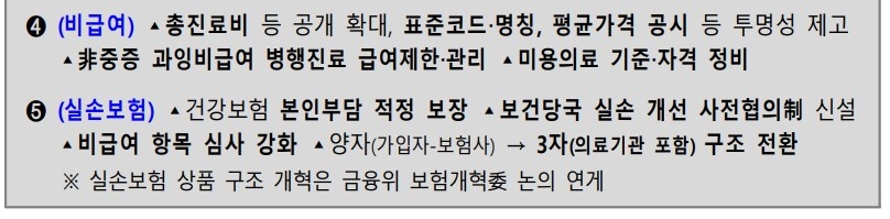 실손보험 제도 개선방안의 경우에는 ▲경증환자 상급병원·응급실 비용 본인부담 상향, 건보 본인부담 보장 단계적 축소 등 차세대 실손의 건강보험 본인부담제 강화 ▲의료기관의 실손보험 가능 여부 등에 대한 광고·설명 및 보유 여부 질문 금지 제도화(의료법 개정) ▲보험사-의료기관간 협의에 따른 비급여 기준·가격 설정 및 실질적 심사방안을 검토해 현재의 양자 구조(환자-보험사)에서 3자 구조(환자-보험사-의료기관)로 전환 등을 추진한다고 했다.