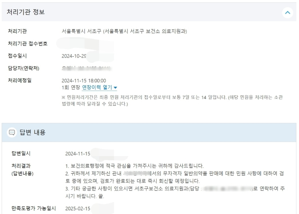 제보자가 함께 전달한 자료에 따르면, 당초 무자격자 일반의약품 판매에 대한 민원사항 처리 예정일은 11월 15일이었으나, 해당 날짜에 민원이 아직 검토 중이라는 답변만 돌아와 있다.