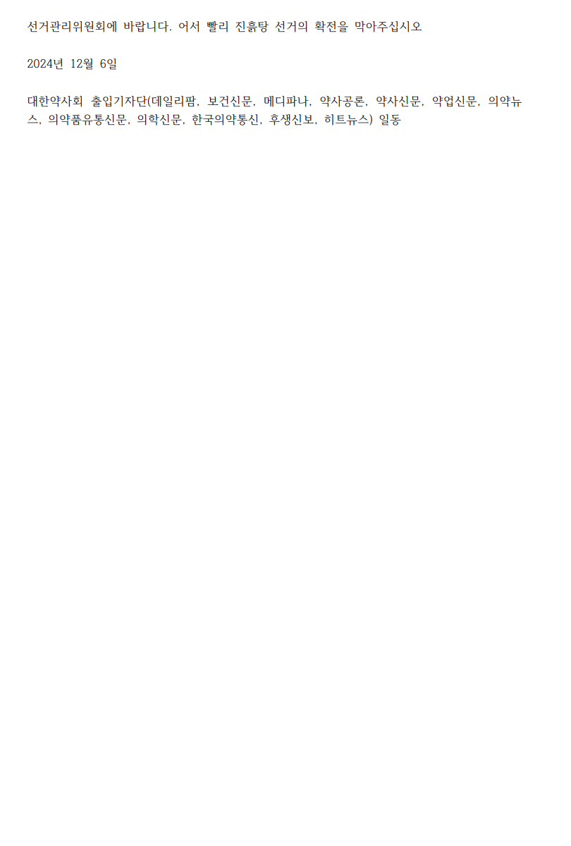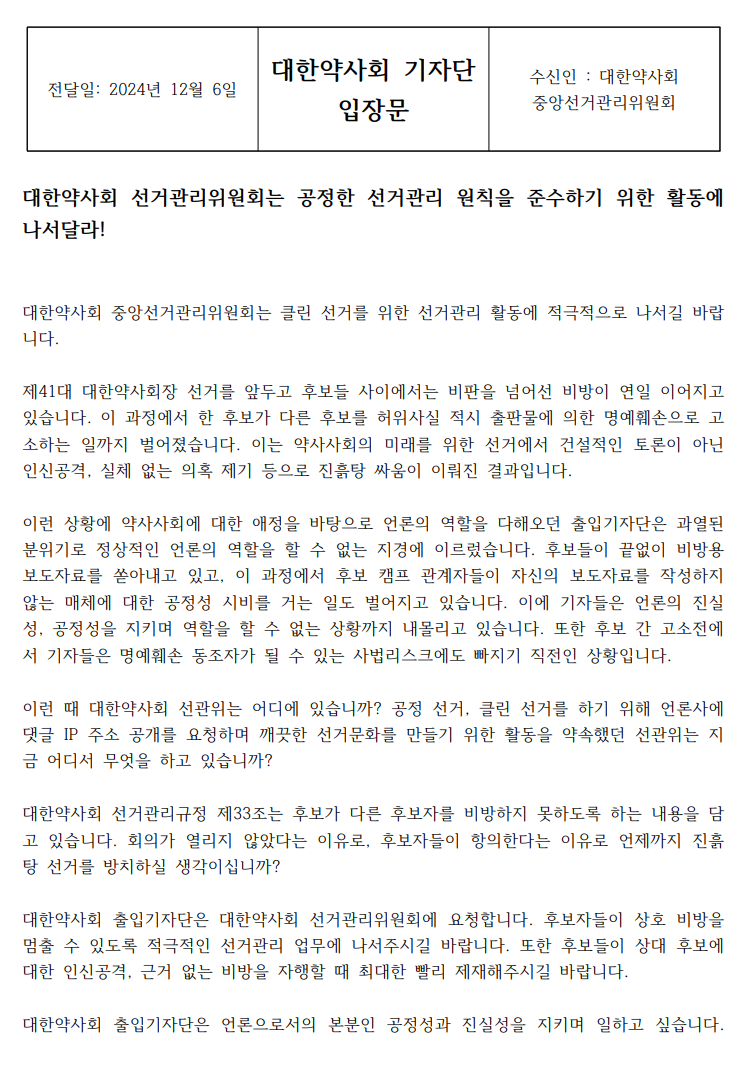약사회 출입기자단은 6일 '대한약사회 선거관리위원회는 공정한 선거관리 원칙을 준수하기 위한 행동에 나서달라'는 제목의 입장문을 발표했다.