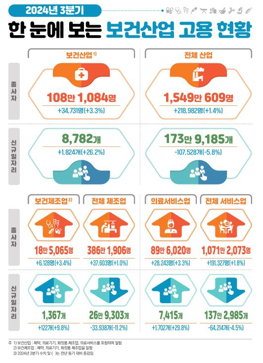 9일 한국보건산업진흥원(원장 차순도, 이하 진흥원)이 발표한 '2024년 3/4분기 보건산업 고용 동향'에 따르면, 3분기 보건산업 종사자 수는 총 108만1000명으로 전년 동기 대비 3.3% 증가했다. 이같은 증가율은 전체 산업(1.4%)보다 1.9%p 높은 것으로 나타났다.