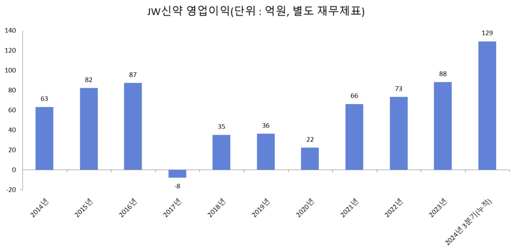 이 회사 영업이익 개선은 2021년부터 나타났다. JW신약 영업이익은 2020년 22억원에서 2021년 66억원으로 3배 가까이 늘었다. 2022년과 지난해 영업이익은 73억원, 88억원으로 전년 같은 기간과 비교해 11.2%(7억원), 20.4%(15억원) 증가했다.