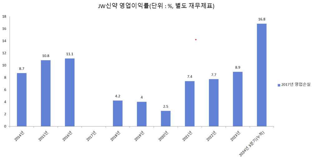 이 회사 연간 영업이익률이 올해 4분기까지 누적으로 10%를 넘어서는 경우, 이는 2016년 이후 8년만이다. JW신약은 2016년에 영업이익률 11.1%를 기록한 바 있다.