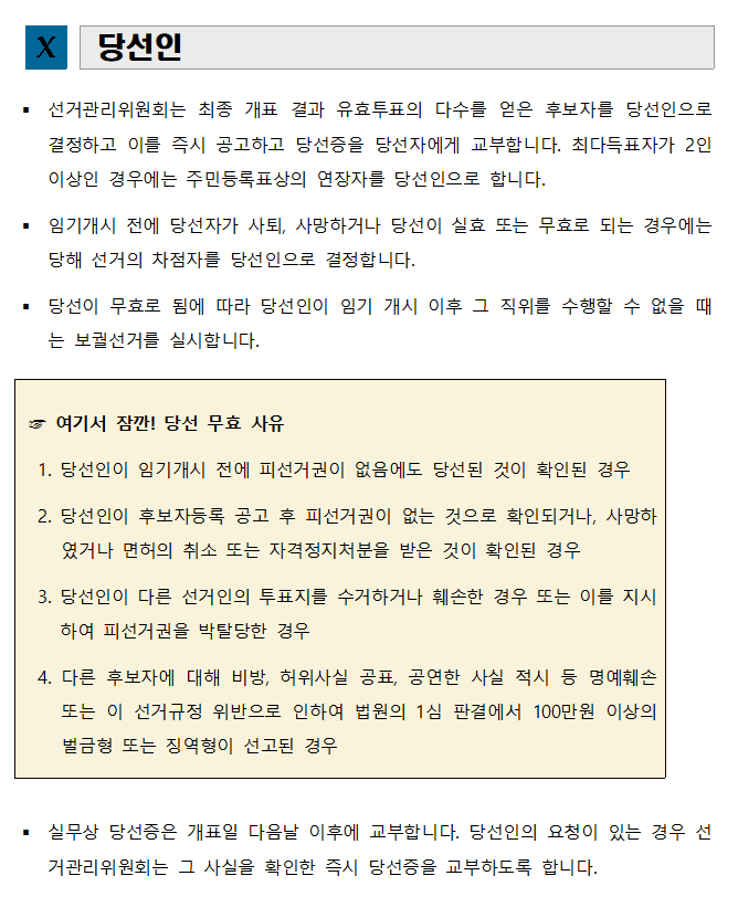 법적 이슈에 대한 결론이 당선 무효 사유가 되는 경우, 임기개시 전이라면 차점자가 당선인이 되며, 임기개시 후로 직위를 수행할 수 없게 된다면 보궐선거를 실시한다.