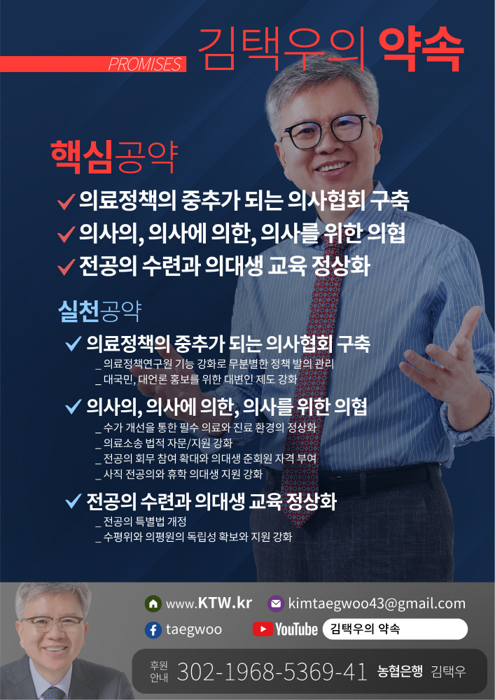 먼저 김택우 후보는 세 가지 공약 가운데 두 가지가 전공의와 의대생 관련 내용이다.
