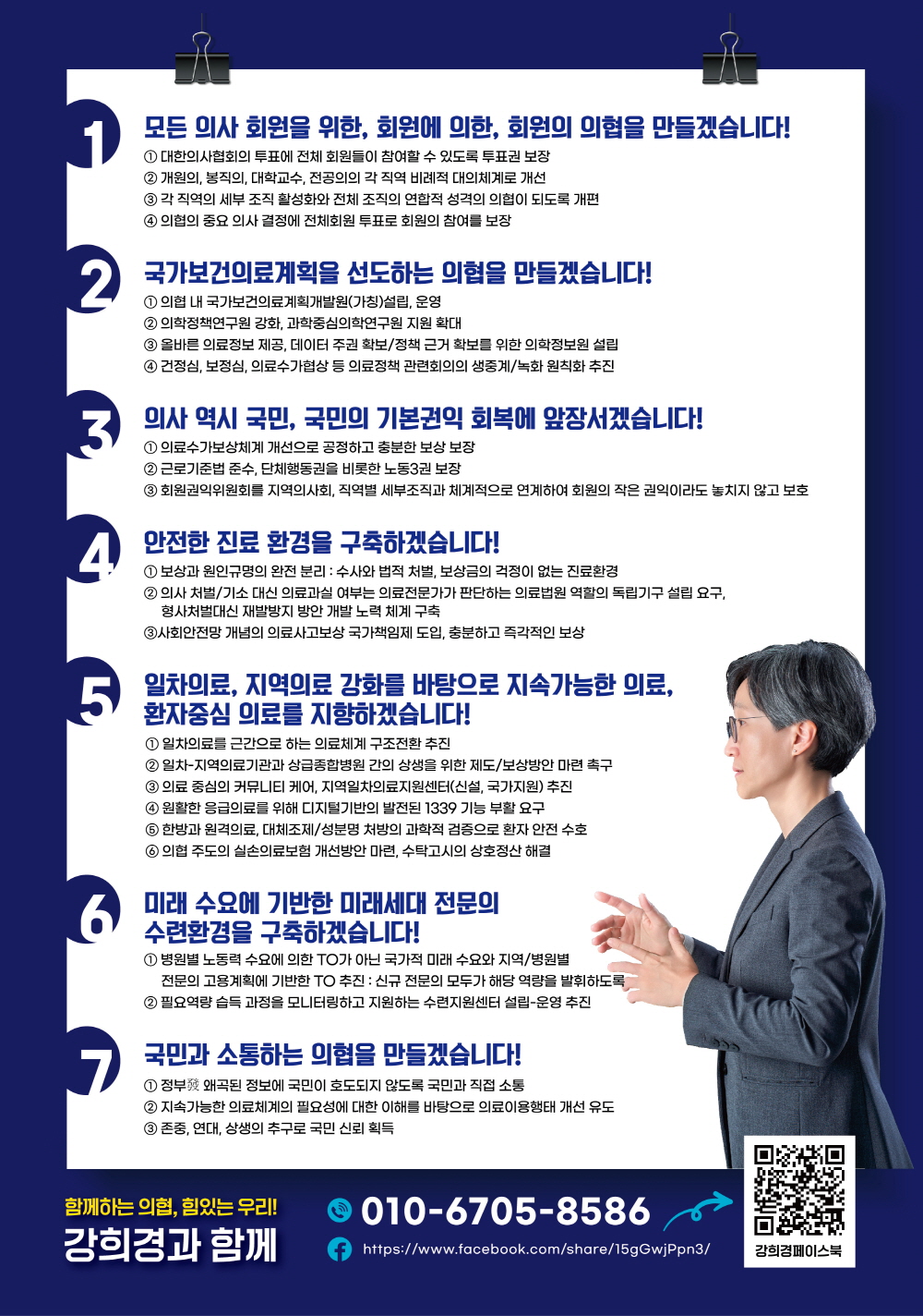 먼저 '의사와 의협 신뢰도 제고'를 위해 ▲능력 위주 집행부 공개 모집 ▲상임이사회 참관제도 활성화 ▲집행부 수임사항 공개 평가 등을 약속했다.