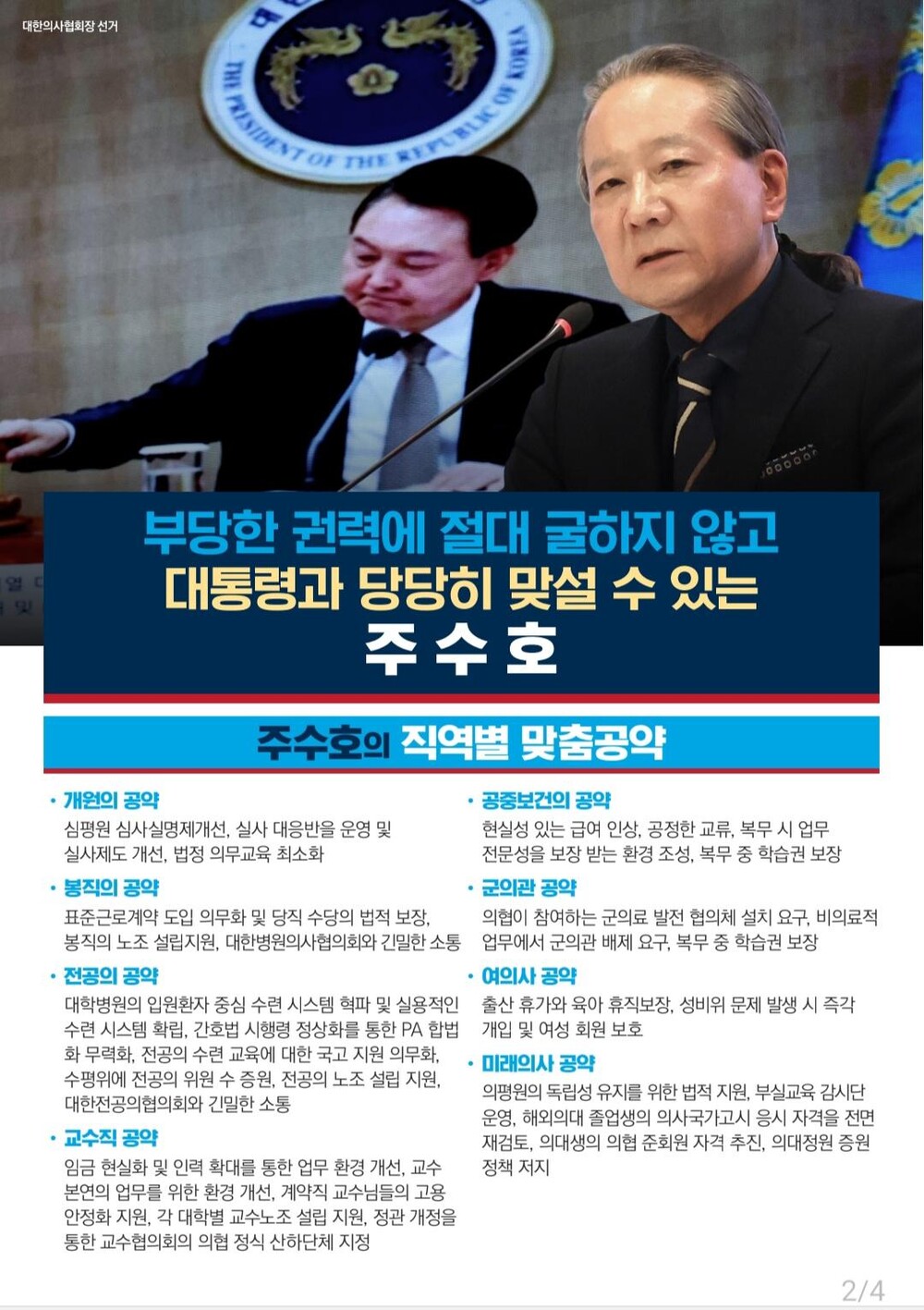 주수호 후보는 핵심공약에서는 의대정원 증원 및 필수의료 정책 패키지 저지를 비롯해 요양기관 강제지정제 폐지 운동 전개, 전국의사노조 설립 등 의료 정상화를 위한 방향 7가지를 제시하고 있다. 전공의와 의대생을 위한 공약은 직역별 공약에 담았다.