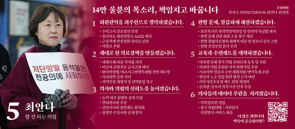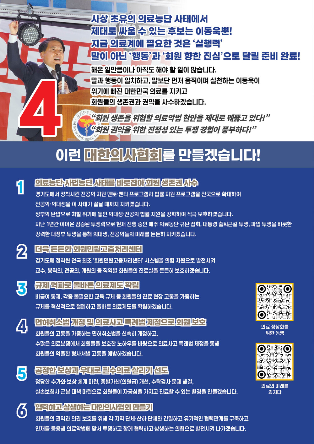 공약에는 의협 회장 당선만으로 풀어낼 수 없는 문제도 다수 포함돼 있지만, 젊은 의사를 위한 후보 의지와 방향성 제시가 확대되는 모습은 긍정적이라는 평가도 나온다.