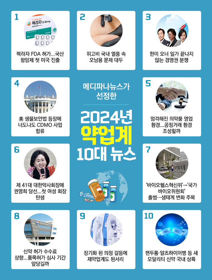 | 올해 약업계 역시 '다사다난(多事多難)'했습니다. 유한양행 '렉라자'가 국산 항암제로선 처음으로 FDA 허가를 받으며 글로벌 진출을 예고한 반면, 한미 오너 일가의 경영권 분쟁도 있었습니다. 정부는 장기화 된 의정 갈등 속에서도 제약바이오산업 육성책과 의약품 공정영업 환경 마련을 위한 제도 마련에 나섰고요. 꿈의 비만 치료제라는 '위고비'도 국내 첫 선을 보이며, 큰 사회적 열풍을 일으켰습니다. 새로운 치료 기전의 편두통 및 초기 알츠하이머병 신약도 국내 상륙하면서국내 임상현장으로부터 기대를 한 몸에 받았는데요. 메디파나뉴스는 2024년 한 해 동안 있었던 크고 작은 일들을 돌아보며, 약업계 10대 뉴스를 정리했습니다.<편집자주> |