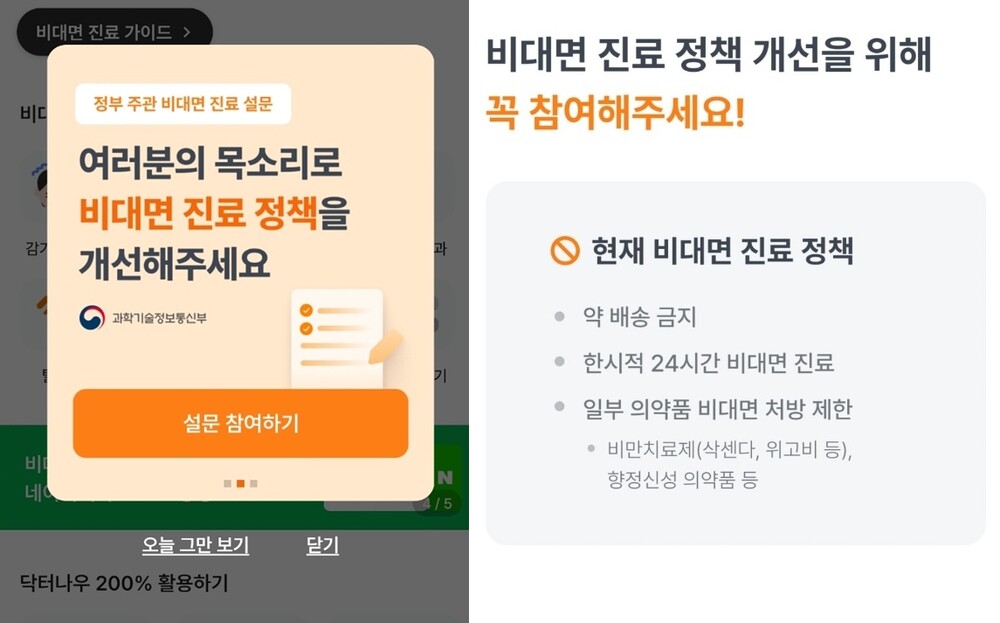 이 가운데 닥터나우는 ▲약 배송 금지 ▲한시적 24시간 비대면진료 ▲일부 의약품 비대면 처방 제한(비만치료제, 향정신성의약품) 등 현재 비대면진료 정책을 언급하며, 정책 개선을 위한 참여 방법을 안내하고 있다.
