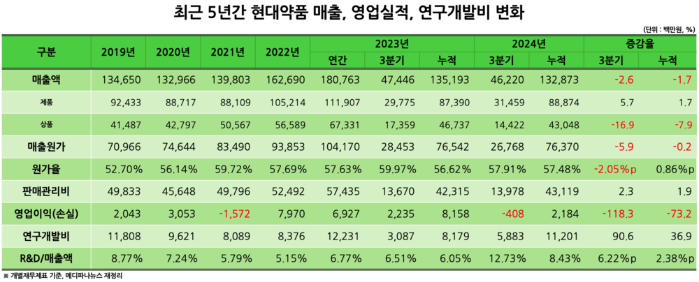 현대약품은 2019년 연구개발비로 118억원을 사용한 이후 코로나19 팬데믹 시기 R&D 투자 규모를 줄이며 2021년과 2022년 각각 81억원, 84억원을 기록한 바 있다. 2019년 8.77%이던 매출 대비 연구개발비 비중은 2021년과 2022년 5%대로 감소했다.