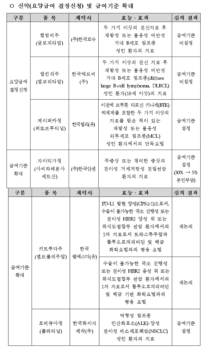 반면 한국릴리 외투세포 림프종(MCL) 치료제 '제이퍼카(퍼토브루티닙)'는 급여 첫 관문을 넘었다.