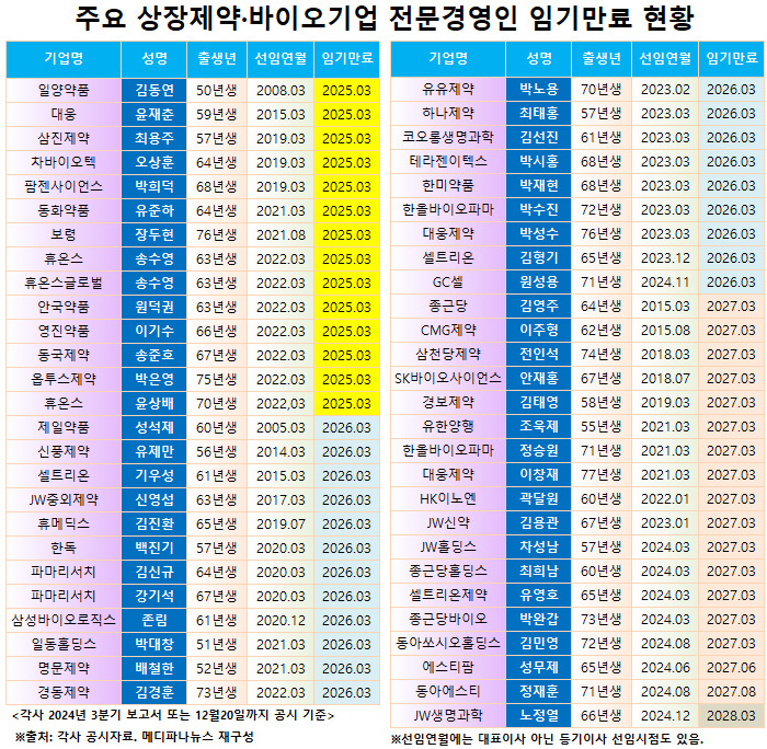 정기주총 시즌인 2025년 3월 임기만료를 앞둔 전문경영인은 ▲일양약품 김동연(50년생) ▲삼진제약 최용주(57년생) ▲대웅 윤재춘(59년생) ▲휴온스 송수영(63년생) ▲휴온스글로벌 송수영(63년생) ▲안국약품 원덕권(63년생) ▲차바이오텍 오상훈(64년생) ▲동화약품 유준하(64년생) ▲영진약품 이기수(66년생) ▲동국제약 송준호(67년생) ▲팜젠사이언스 박희덕(68년생) ▲휴온스 윤상배(70년생) ▲옵투스제약 박은영(75년생) ▲보령 장두현(76년생) 등이다. (나이 順)