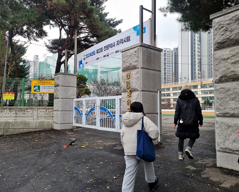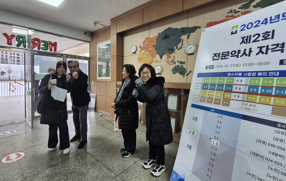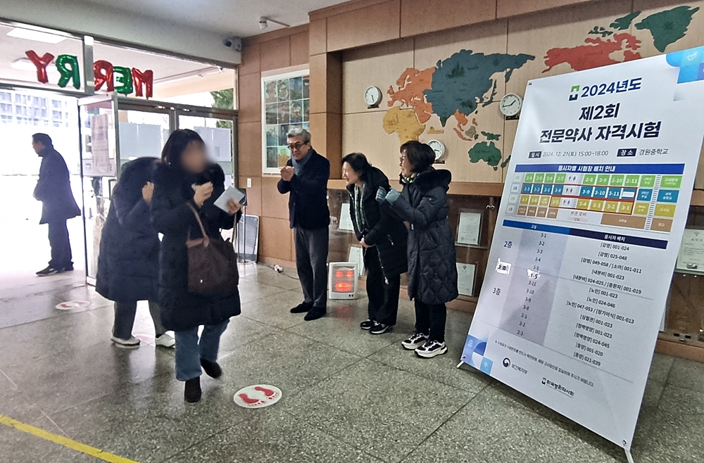 한국병원약사회 김정태 회장, 민명숙 전문약사운영단장, 정경주 차기 한국병원약사회장을 비롯해 손현아 사무국장 및 사무국 직원들은 수험생들을 응원하기 위해 추운 날씨에도 현장을 찾아 입장하는 수험생들에게 파이팅 넘치는 인사를 건넸다.