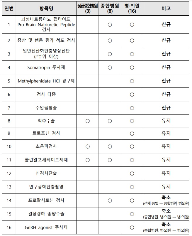 2025년 신규 항목은 총 7항목으로 ▲뇌성나트륨이뇨 펩타이드 검사 ▲증상 및 행동 평가 척도 검사 ▲일반전산화단층영상진단(2부위 이상) ▲Somatropin 주사제 ▲Methylphenidate HCl 경구제 ▲검사 다종 ▲수압팽창술이며, 해당 항목은 진료비가 지속적으로 증가하거나, 급여기준 적용에 대한 안내 필요 및 오남용 가능성이 있어 적정진료 유도가 필요한 항목이다.
