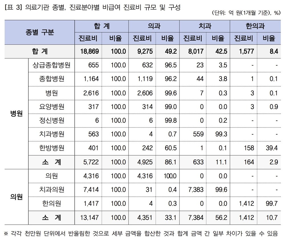 종별로는 치과의원이 7414억원으로 39.3%를 차지하면서 가장 큰 진료비 규모를 나타냈고, 의원 4316억원(22.9%), 병원 2616억원(13.9%), 한의원 1417억원(7.5%) 등이 뒤를 이었다.