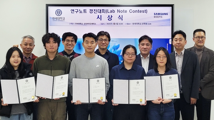 삼성바이오에피스는 지난 6일, 연세대학교 신촌캠퍼스에서 '연구노트 경진대회' 시상식을 개최하고 생명시스템대학 학부 및 대학원생에게 우수 상패와 함께 총 1000만원의 장학금을 전달했다.