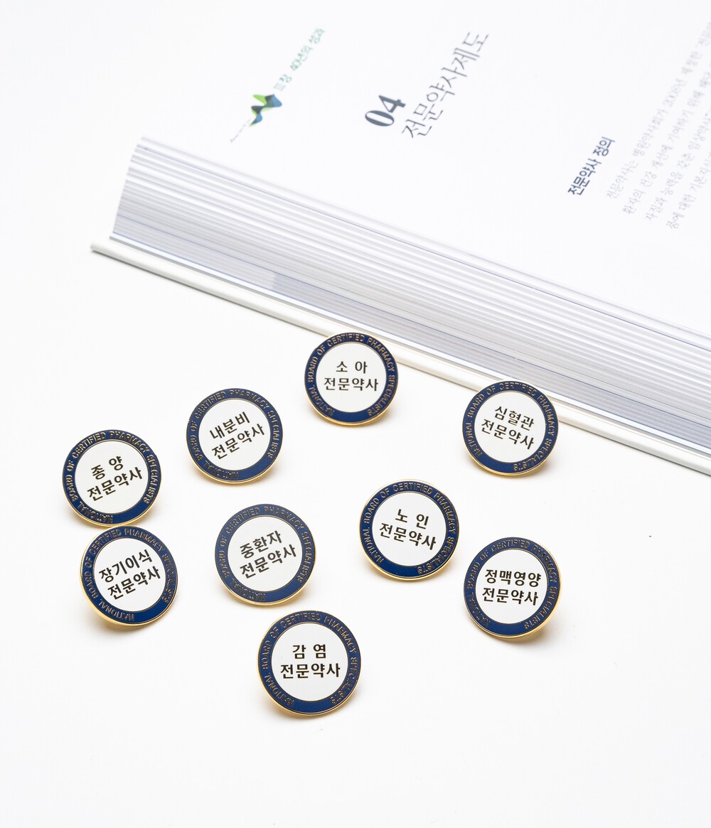 배지에는 내분비, 노인, 심혈관, 감염, 정맥영양, 장기이식, 종양, 중환자 등 총 9개 전문과목 분야가 적혀있어 한 눈에 전문약사의 전문과목을 확인할 수 있다.