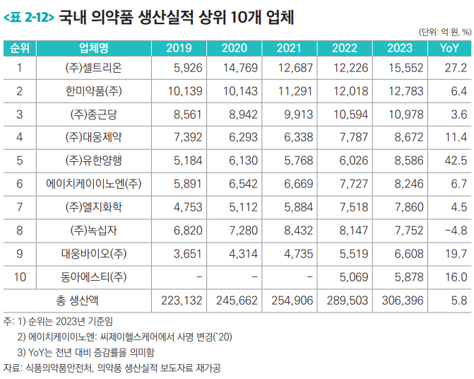 에이치케이이노엔또한 8246억원으로 8000억원을 넘겼고, 엘지화학은 7860억원, 녹십자 7752억원, 대웅바이오 6608억원, 동아에스티 5878억원으로 생산실적 상위 10개 업체에 이름을 올렸다.