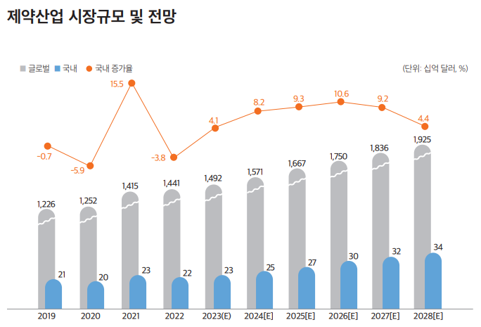 제약산업 시장규모에 대해서는 글로벌 제약산업의 시장 규모가 지속적으로 증가할 것으로 전망된다. 글로벌 제약시장은 2028년까지 1조9260억 달러(2795조2038억원)에 달할 것으로 예측되며, 한국은 같은 해 340억원을 기록할 것으로 예상되고 있다.