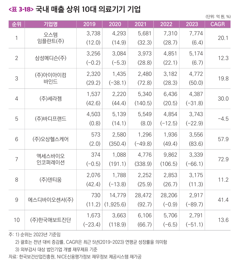 이로 인해 매출 상위 10대 국내 의료기기 기업에도 큰 변화가 있었다. 오스템임플란트는 2023년 매출 7774억원을 기록, 2019년 이후 처음으로 가장 많은 매출을 올린 국내 의료기기 기업이 됐다. 덴티움도 2023년 매출 3175억원을 기록, 상위 10대 기업 중 8위를 기록했다.