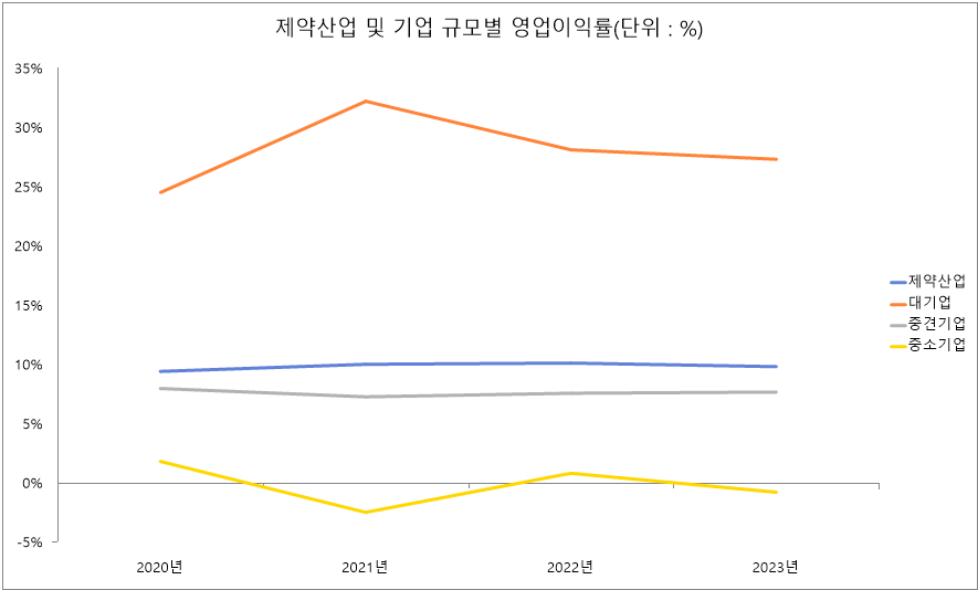 기업 규모별로 구분하면, 대기업은 4년 연속 두 자릿수 영업이익률을 기록했다. 특히 대기업 영업이익률은 2021년에 32.3%로 가장 높았으며, 2022년과 2023년에 20%대 후반으로 집계됐다.