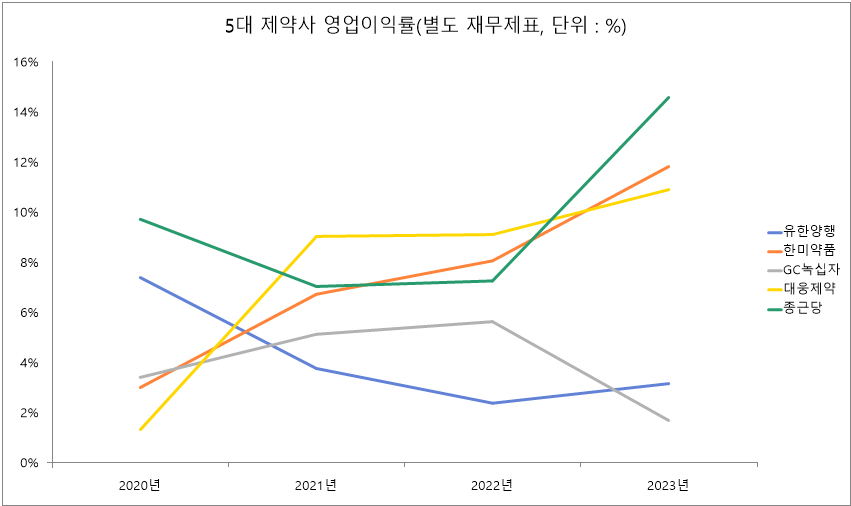 종근당은 2020년에 영업이익률 9.7%를 기록하며, 2위 유한양행을 2.3%p 차이로 앞섰다. 이어 2021년 대웅제약, 2022년 대웅제약·한미약품에 밀려 각각 2, 3위에 이름을 올렸으나, 2023년 들어 영업이익률을 14%대로 끌어올려 1위에 올라섰다.