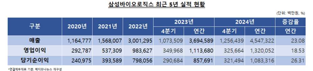 삼성바이오로직스는 2020년 매출 1조원을 넘어선 이후 가파른 성장세를 보이고 있다. 2022년 매출 3조원, 지난해 4조원 돌파에 성공했다. 영업이익도 2023년부터는 1조원을 넘어선 것으로 나타났다.