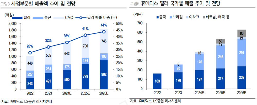 필러 수출이 고성장하면서 휴메딕스의 올해 필러 부문 예상 매출은 779억원(내수 246억원, 수출 533억원)으로, CMO 부문 예상 매출(706억원)을 넘어설 것으로 전망된다.