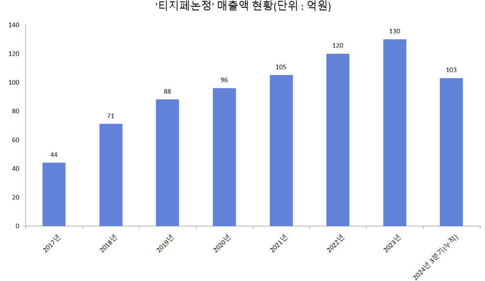 공시 자료에 따르면, 티지페논정 매출액은 출시 첫해인 2017년 44억원에서 지난해 130억원으로 3배 가까이 늘었다. 연평균 증가율로 환산하면, 매출액이 6년간 매년 20%가량 증가한 셈이다.