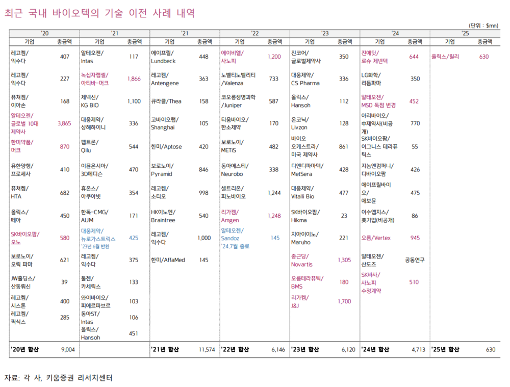 한편, 글로벌 빅파마를 포함해 최근 국내 바이오텍이 해외 제약바이오사에 기술이전한 사례는 2020년 13건, 2021년 24건, 2022년 9건, 2023년 12건, 2024년 11건, 2025년 현재 1건으로 파악됐다.