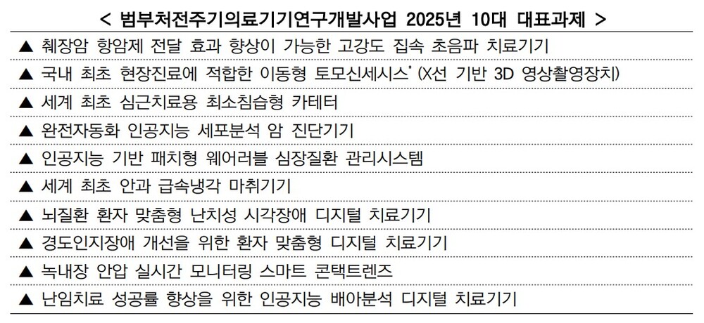지난해 3월 선정된 '2024년 10대 대표과제' 중 국내 최초로 개발된 혈액투석 의료기기는 일반 환자를 대상으로 성공적인 치료를 수행하는 등 뛰어난 성과를 창출한 만큼, 올해 선정된 10대 대표과제도 의료기기 국산화와 글로벌 시장 진출을 촉진하고 환자들의 삶의 질 향상에 기여할 것으로 정부는 기대하고 있다.