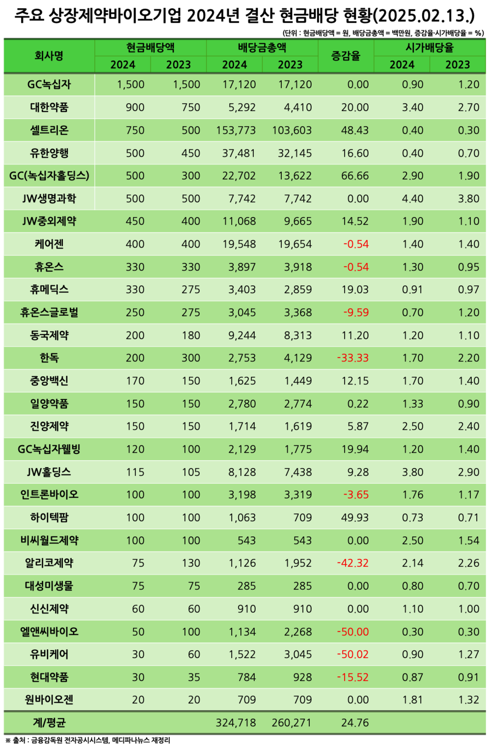 메디파나뉴스가 지주사를 포함해 13일까지 공시한 28개 상장 제약바이오 기업들의 보통주 기준 결산 현금배당을 집계한 자료에 따르면 배당금 총액은 3247억원으로 2023년도 2603억원 대비 24.76% 증가한 것으로 나타났다.