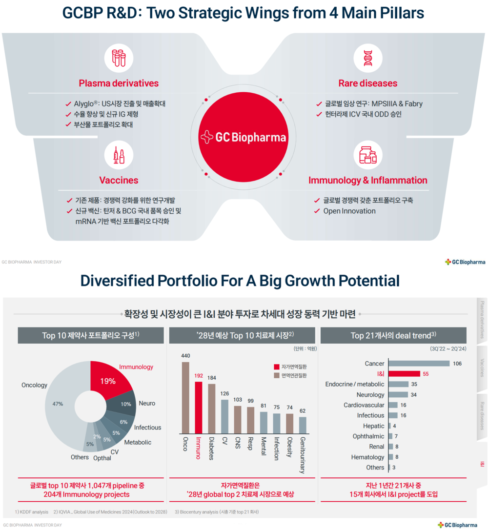 다만, 제약사의 꾸준한 펀더멘탈 개선은 결국 R&D에서 비롯된다. 이에 GC녹십자는 기존의 주요 R&D 전략이었던 혈장분획제제, 백신, 희귀질환과 함께 면역 및 염증 질환(I&I)에 대한 부분을 추가했다.