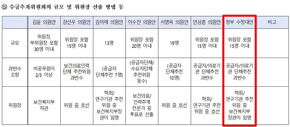 그러나 정부 대안은 위원장 1명을 포함해 15명으로 위원을 구성하고, '보건의료인력 직종별 단체 및 의료기관단체'가 추천하는 전문가가 과반이 되도록 했다. 의사의 경우 의협과 병협 추천 위원이 과반이 되도록 한 셈이다. 위원장 역시 전문가 위원 중 보건복지부 장관이 임명토록 했다. 나머지 과반은 노동자 단체, 소비자·환자관련 시민단체 추천 전문가와 보건의료 관련 학회·연구기관 추천 전문가로 채우는 방식이다.