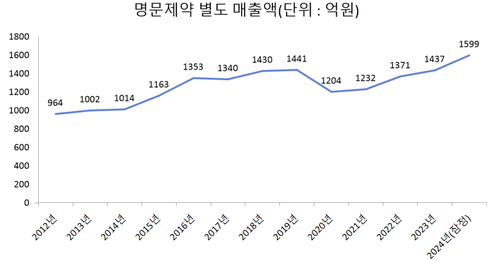 지난해 명문제약 별도 매출액(1599억원)은 1600억원에 육박하며 회복세를 이어갔다. 1599억원은 2019년 이 회사가 기록한 별도 매출액 최고 기록 1441억원을 넘어서는 규모다.