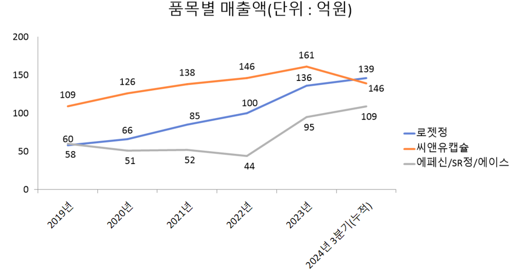 에페신 품목군 매출액은 씨앤유캡슐과 다르게 2019년 60억원으로 정점을 찍은 후 코로나19 팬데믹 기간에 줄었으나, 2023년 반등에 성공했다. 당시 매출액은 95억원으로, 전년 44억원 대비 2배 이상 늘었다.