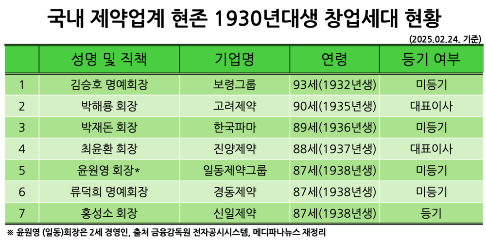 이 밖에도 1930년대생 제약기업 창업주로는 ▲보령그룹 김승호 명예회장 ▲한국파마 박재돈 회장 ▲일동제약그룹 윤원영 회장(2세 경영인) ▲경동제약 류덕희 명예회장 등이 있으나, 이들은 현재 등기임원직에서 물러난 상황이다.