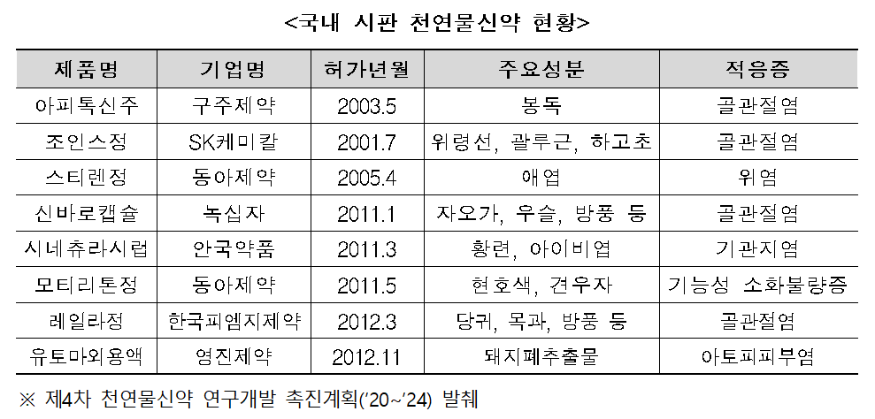 복지부 자료에 따르면, '천연물신약 연구개발 촉진법' 제정 이후 현재 국내 시판 중인 천연물신약은 '조인스정, 아피톡신주, 스티렌정, 신바로캡슐, 시네츄라시럽, 모티리톤정, 레일라정, 유토마외용액' 등 총 8개다. 이 중 조인스정과 스티렌정이 '2025년 급여 적정성 재평가' 대상에 포함됐다.