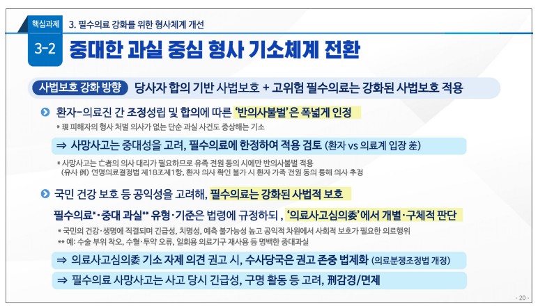 또 의료사고의 특수성을 고려해서 중대과실의료사고를 중심으로 형사기소체계 전환을 추진한다. 책임보험 가입, 의료분쟁조정제도 참여, 진료기록거부와 같은 기본적인 조건들을 바탕으로 의료사고 원인 및 피해에 대해서 신속한 실체 규명, 충분한 보상여건 마련 등이 갖춰진 경우에 이러한 것들을 바탕으로 사법적 보호를 적용한다.