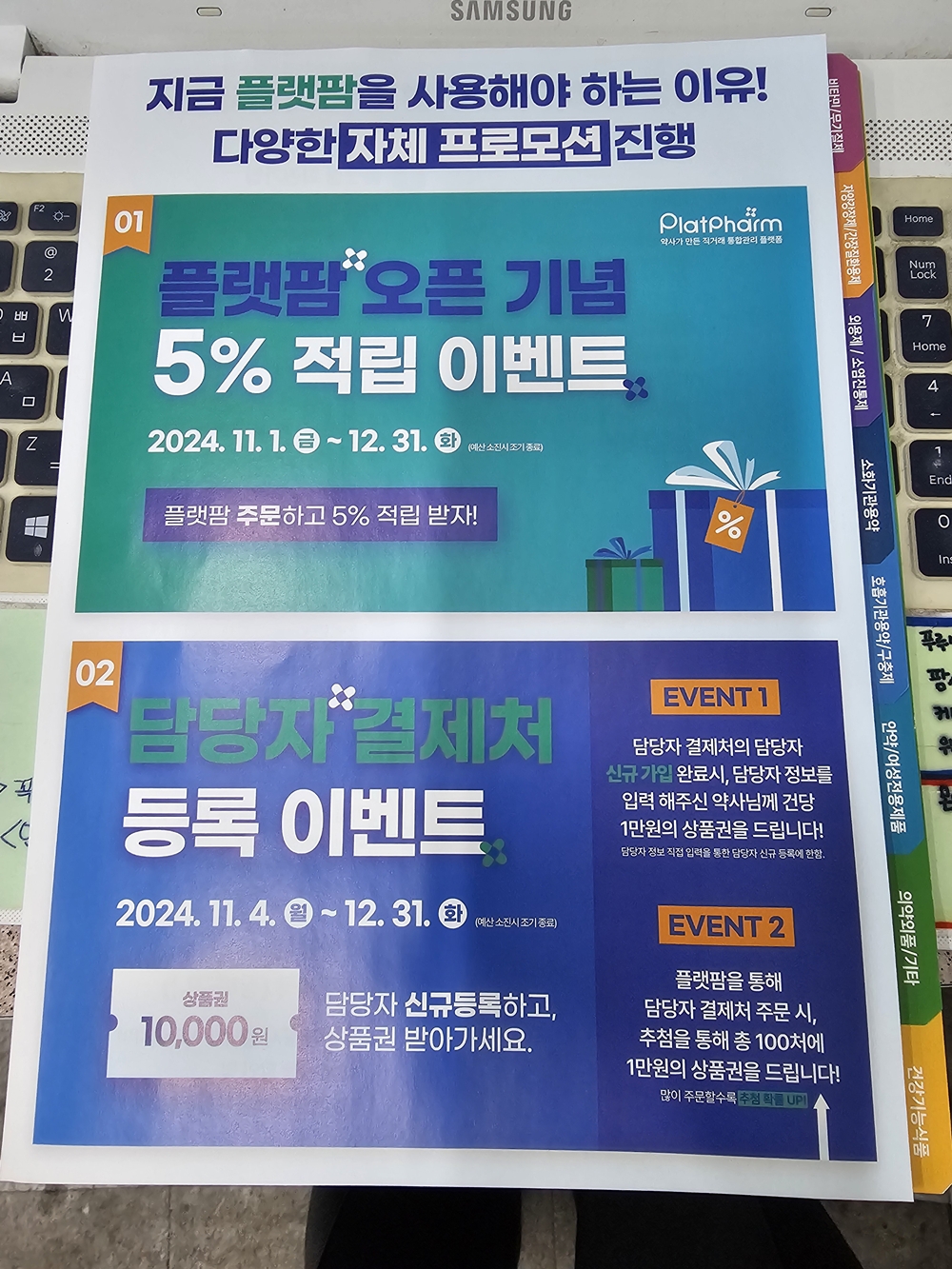 이와 함께 '담당자 결제처 등록 이벤트'를 진행해 신규 가입 완료 시 담당자 정보를 입력한 약국 약사에게 건당 1만원 상품권을 제공하고, 플랫팜을 통해 담당자 결제처를 주문하면 추첨으로 약국 100곳에 1만원 상품권을 제공하기도 했다. 추첨 확률은 주문량이 늘어날수록 높아진다.