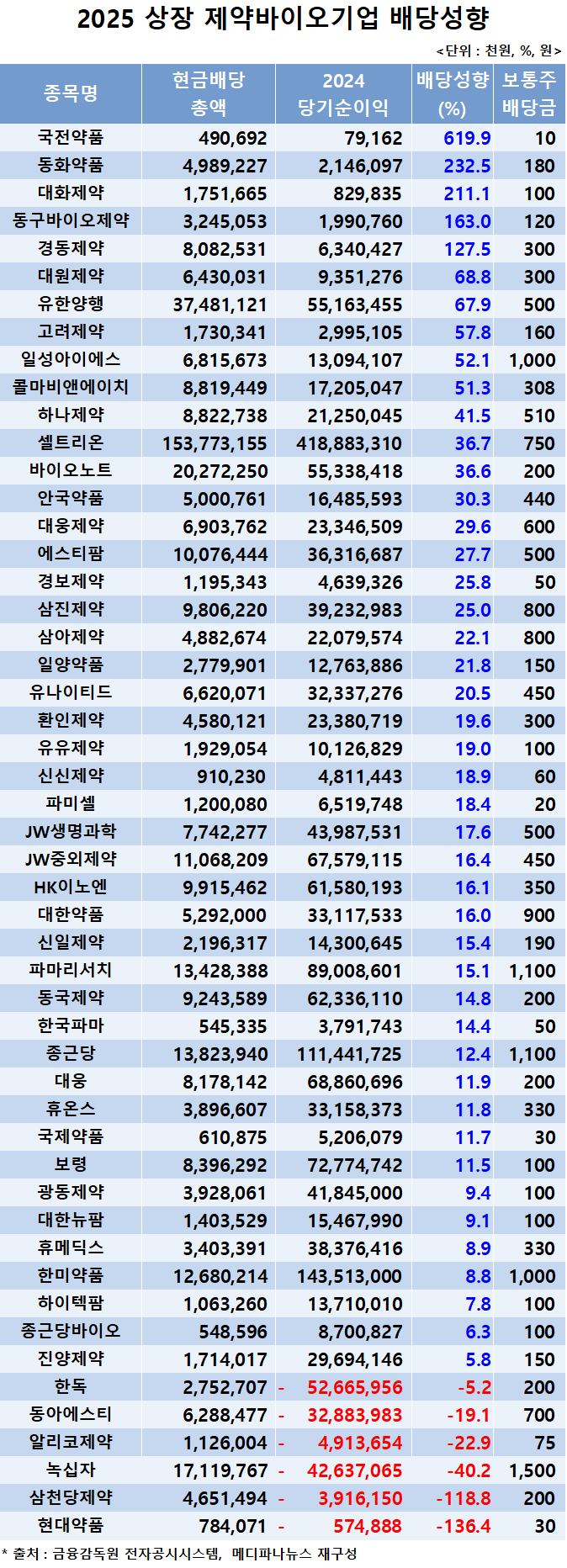 메디파나뉴스는 금융감독원 전자공시시스템을 통해 지난 15일까지 공시된 제약·바이오 기업의 현금 배당총액과 2024년 당기순이익을 집계해 배당성향(배당금 총액/순이익x100)을 계산했다. 그 결과, 코스닥 기업인 국전약품이 619.9%로 가장 높은 배당성향을 기록했다.