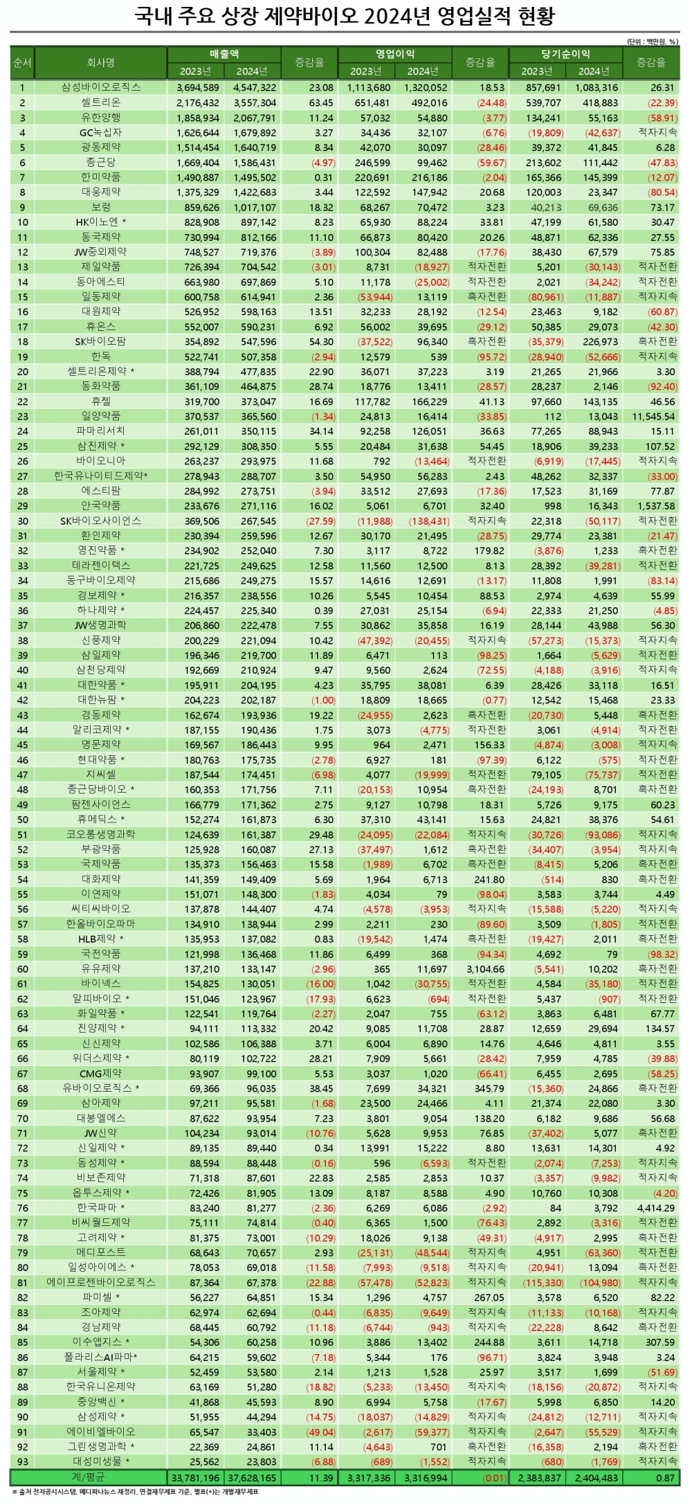 기업별로는, 지난해 최다 매출을 기록한 삼성바이오로직스가 전년 대비 18.53% 성장한 1조3201억원으로 지난해에 이어 2년 연속 1조원대 영업이익을 기록했다.
