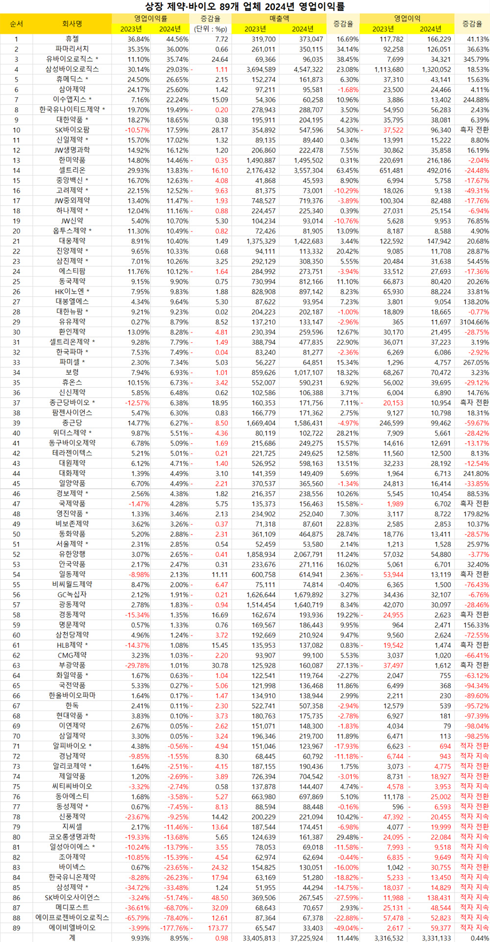 18일 금융감독원 전자공시시스템 자료에 따르면, 메디파나뉴스가 집계한 상장 제약·바이오 89개 업체 지난해 영업이익률은 연결·개별 재무제표 기준으로 8.95%다. 이는 전년 영업이익률 9.93% 대비 0.98%p 감소한 수치다.