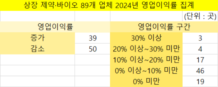 89개 업체 가운데 가장 많은 기업(46곳)이 분포한 구간은 지난해 영업이익률 0% 이상 10% 미만으로 나타났다. 유한양행, 종근당, 보령, 동화약품, 일동제약, 일양약품 등 전통 제약업체 다수는 해당 구간에 이름을 올렸다.