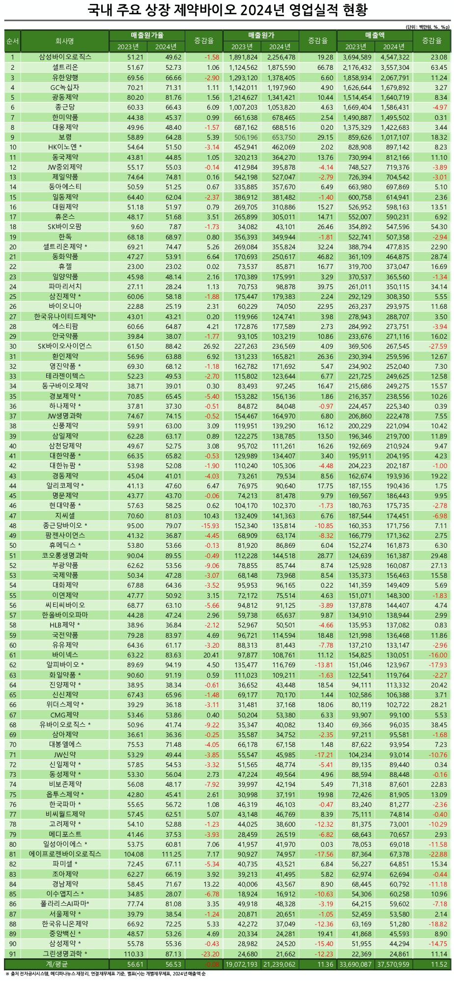 19일 메디파나뉴스가 91개 상장 제약·바이오 업체 지난해 사업보고서 연결·개별재무제표를 분석한 결과, 지난해 총 매출원가는 21조2391억원으로 집계됐다. 같은 기간 총 매출액은 37조5710억원으로 평균 매출원가율은 56.53%로 나타났다.