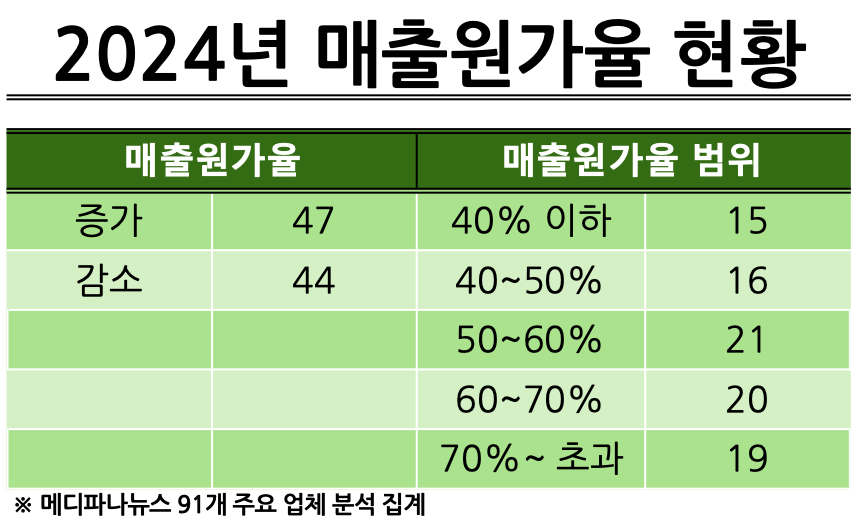 업체 수로 보면, 전년 대비 매출원가율이 증가한 곳은 47개사, 줄어든 곳은 44개사로, 매출원가 부담이 커진 기업이 그렇지 않은 경우보다 많았다.