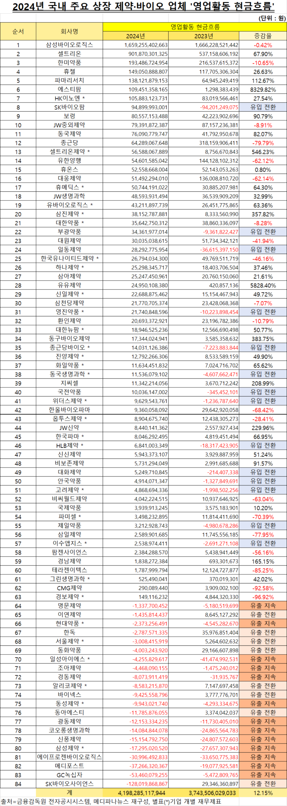 20일 메디파나뉴스가 금융감독원 전자공시시스템을 통해 제약·바이오 업체 84곳 사업보고서를 분석한 결과에 따르면, 국내 상장 제약·바이오 업체 84곳 지난해 영업활동 현금흐름은 4조1983억원이다. 이는 전년 3조7435억원 대비 12.15%(4548억원) 증가한 규모다.